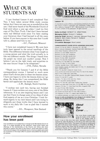 The document contains testimonials from several students who have completed Lesson 8 of the Bible correspondence course from the Worldwide Church of God. The students praise the course for opening their eyes to biblical truths they had not understood before. One student says they feel they have learned more real biblical truth from the course than in all previous years. Another says their mind can now accept teachings they previously heard from the pulpit. A third writes that Lessons 7 and 8 alone taught them so much about God's divine plan. All express eagerness to continue learning from the course.