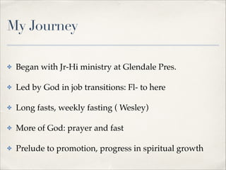 The document discusses the biblical significance of fasting as a means to deepen one's relationship with God, highlighting its historical context in both the Old and New Testaments. It emphasizes the importance of choosing God's strength over personal desires and outlines prayer targets for greater encounters with God during a proposed fortnight fast. The author encourages participants to seek God’s guidance on their fasting journey, promoting a spirit of joy and accountability in the process.