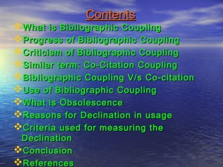 The document discusses bibliographic coupling, co-citation coupling, and obsolescence. It defines bibliographic coupling as the relationship between two works that cite a common work, and co-citation coupling as the relationship between two works that are both cited by a third work. It outlines criticisms of bibliographic coupling and describes how co-citation coupling and author co-citation analysis evolved as alternative methods. Uses of bibliographic coupling include finding related research and understanding the development of new subjects. The document also defines obsolescence as the reduced use of information over time, and lists reasons for and criteria to measure the declination in usage of information.