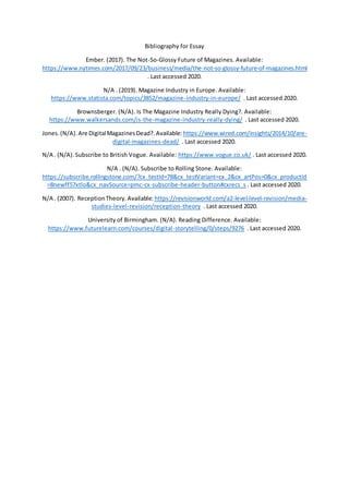 This document provides a bibliography or list of 8 sources referenced in an essay on the magazine industry. The sources include newspaper articles, industry reports, and academic pages that discuss topics like the future of print magazines, the state of the magazine industry in Europe, whether magazines are truly dying, whether digital magazines are dead, subscriptions to magazines like British Vogue and Rolling Stone, reception theory, and reading difference.