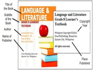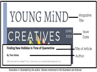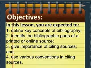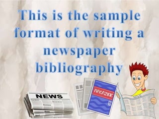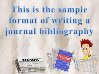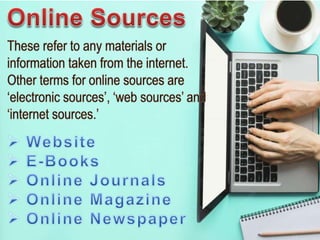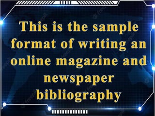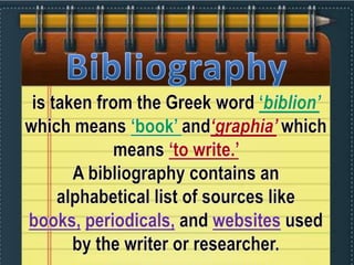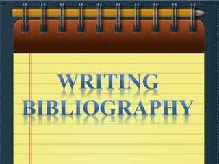 This document provides guidelines and examples for writing bibliographic citations for different types of sources, including books, academic journals, magazines, newspapers, websites, ebooks, databases, and online periodicals. It explains the common elements to include for each source such as author name, title, publication details, and URL as applicable. Standard citation formats are demonstrated through examples for each source type.