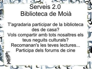 Serveis 2.0 Biblioteca de Moià T'agradaria participar de la biblioteca des de casa? Vols compartir amb tots nosaltres els teus neguits culturals? Recomanan's les teves lectures... Participa dels forums de cine