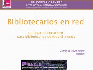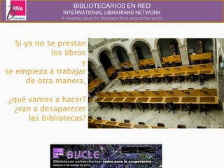 The document describes Bibliotecarios en Red, an international network for librarians. It provides a place for librarians around the world to meet and connect through online discussions, blogs and Twitter. To participate, librarians need an internet connection, basic English skills, and a willingness to learn and connect with other colleagues.