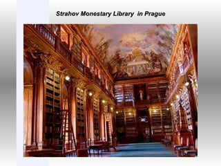 The document lists and describes many of the most beautiful libraries from around the world, including the Strahov Monastery Library in Prague, the Abbey Library in St. Gallen, Switzerland, and the Biblioteca Palafoxiana in Puebla, Mexico. It provides images and brief descriptions of the architectural features and collections of each library.