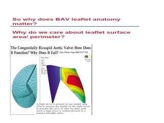 This document discusses bicuspid aortic valve (BAV), including its pathogenesis, diagnosis, natural history, and management. Key points include: