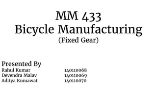 The document details the fixed gear bicycle manufacturing process, emphasizing the significance of the main frame, materials, and advanced manufacturing techniques. It outlines the importance of frame components, the evolution of materials from steel to aluminum and composites, and the intricate processes involved in creating seamless tubes and aligning frames. Additionally, it covers the production of wheels, sprockets, and chains, highlighting traditional and non-traditional methods in bicycle component manufacturing.