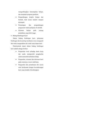 Dokumen tersebut membahas empat bidang bimbingan dan konseling yaitu bimbingan pribadi, sosial, belajar, dan karir. Bidang bimbingan pribadi membantu siswa mengembangkan diri secara utuh, sosial membantu siswa berinteraksi dengan lingkungan, belajar membantu siswa belajar dengan baik, sedangkan karir membantu mengenali potensi karir di masa depan.