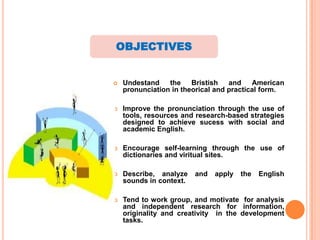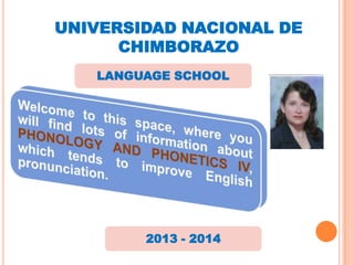 This document outlines the objectives of a language school at the Universidad Nacional de Chimborazo for the 2013-2014 year. The objectives are to understand British and American pronunciation theoretically and practically, improve pronunciation using tools and strategies for social and academic English, encourage self-learning through dictionaries and websites, describe, analyze and apply English sounds in context, and work in groups to motivate analysis, independent research, originality and creativity in tasks.