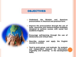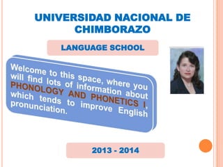 This document outlines the objectives of a language school at the Universidad Nacional de Chimborazo for the 2013-2014 year. The objectives are to understand British and American pronunciation theoretically and practically, improve pronunciation using tools and strategies for social and academic English, encourage self-learning through dictionaries and websites, describe, analyze and apply English sounds in context, and work in groups to motivate analysis, independent research, originality and creativity in tasks.