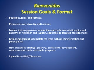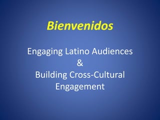 El documento discute estrategias para involucrar al público latino en las instituciones culturales, destacando la importancia de un compromiso institucional y una cultura organizacional saludable. Se enfatiza la necesidad de construir relaciones, comprender la diversidad cultural y adaptar los programas para aumentar la participación de diversas comunidades. Además, se presentan ejemplos de iniciativas exitosas en el Museum of Latin American Art para fomentar la inclusividad y el acceso a las artes.