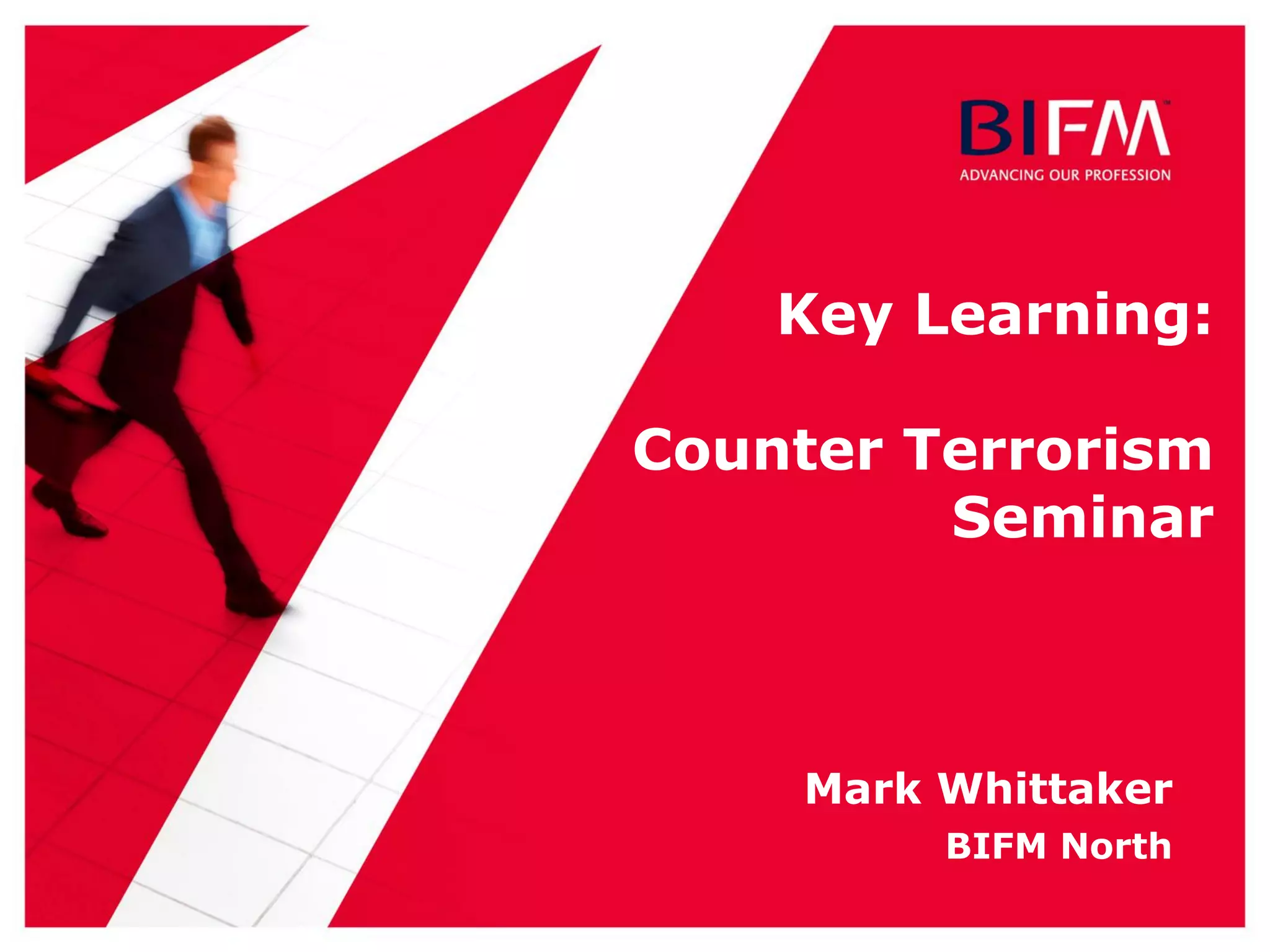 This document summarizes a seminar on counter terrorism. It discusses the reality of terrorism threats, how facilities management can help manage those threats, and ways to motivate a guard force to be effective in deterring terrorism. Specific topics covered include identifying terrorism risks, establishing security measures and plans, the role of manned guarding, characteristics of low and high guard force motivation, and how keeping motivation levels high provides an effective deterrent against terrorism threats.