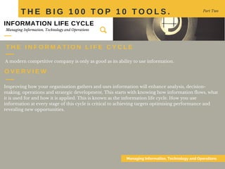 The document discusses the importance of managing information throughout its life cycle to enhance organizational performance and decision-making. It emphasizes gathering and organizing relevant data, using effective analysis, and acting on the information collected to achieve strategic objectives. Additionally, it highlights key tools and principles, such as the Pareto principle, effective negotiation strategies, and the change curve, essential for personal and organizational success.