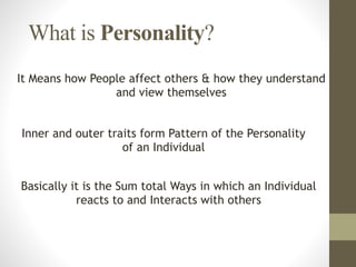 The Big Five Personality Model outlines five core traits: extraversion, agreeableness, conscientiousness, emotional stability, and openness to experience, which together define individual personality. Each trait reflects how people interact with others and manage stress, influencing their behavior and relationships. Personality can be shaped by genetics and environmental factors, and personal growth is possible through self-awareness and development.
