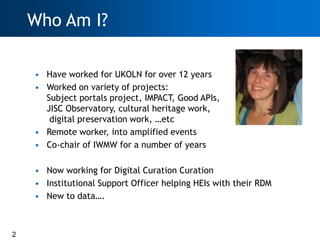 The document discusses the challenges and trends in digital curation, particularly focusing on data management and the role of data in web management for higher education institutions. It covers various types of data, including big data and open data, and emphasizes the need for structured data and effective data management practices to enhance accessibility and usability. Key points include the significance of data analytics, learning analytics, and real-world case studies that illustrate the importance of data in institutional contexts.