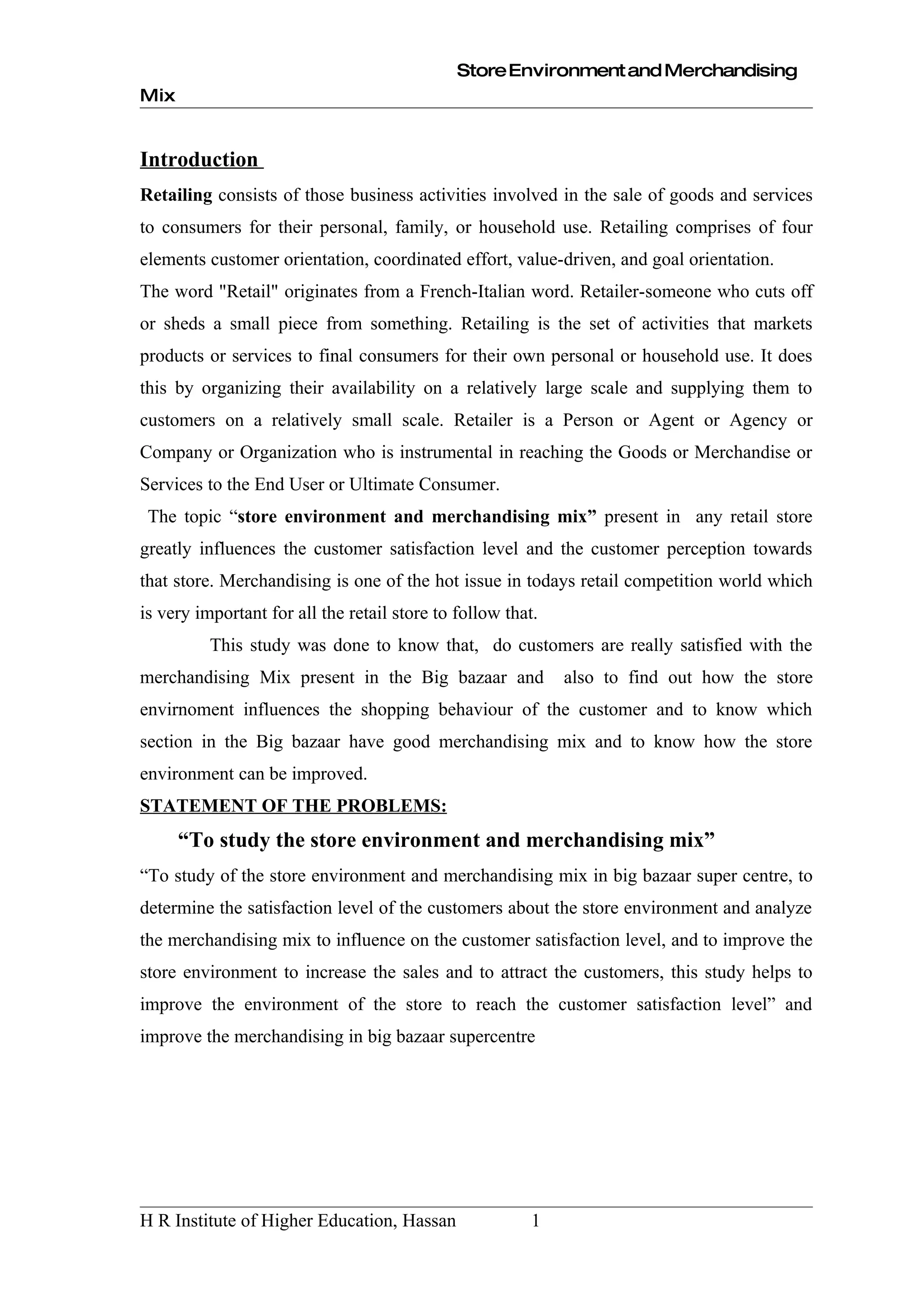 The document discusses store environment and merchandising mix in the retail industry. It begins with introducing key concepts in retailing like customer orientation, coordinated effort, value-driven and goal orientation. It then discusses the importance of store environment and merchandising mix in influencing customer satisfaction and perception. The objectives of the study are to analyze customer satisfaction with store environment and merchandising mix, determine if Big Bazaar has a satisfied merchandising mix, and identify ways to improve the store environment. The document outlines the research methodology and limitations of the study which include lack of detailed urban form and travel behavior data. It also provides an industry profile of the Indian retail sector.