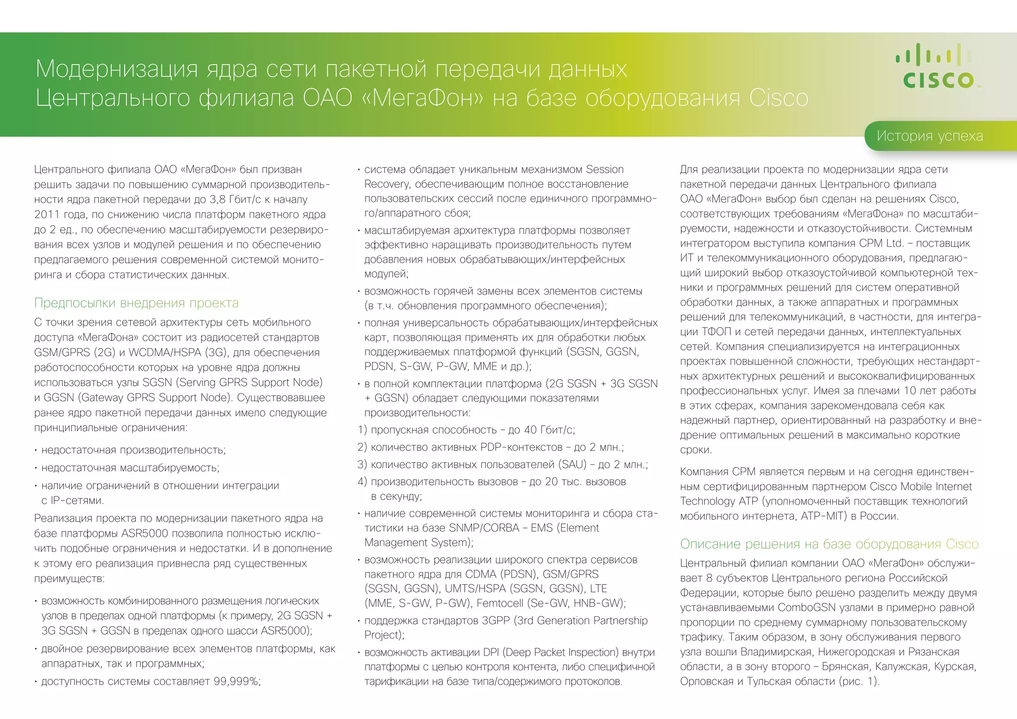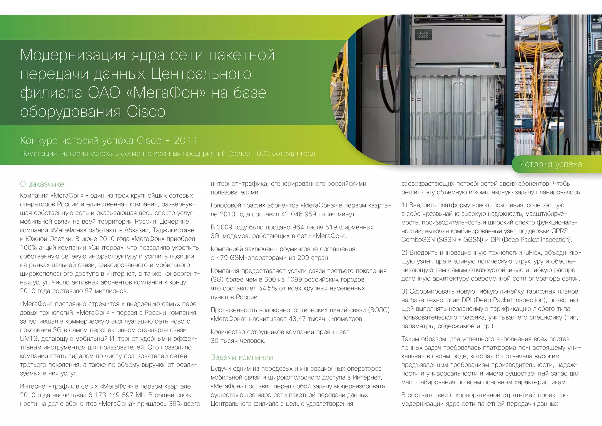Документ представляет собой историю успеха модернизации ядра сети пакетной передачи данных ОАО 'Мегафон' с использованием оборудования Cisco. Основная цель проекта заключалась в повышении производительности, надежности и масштабируемости сети для удовлетворения растущих потребностей пользователей. Реализация нового решения позволила компании стать лидером по числу абонентов третьего поколения связи и обеспечила экономические преимущества.