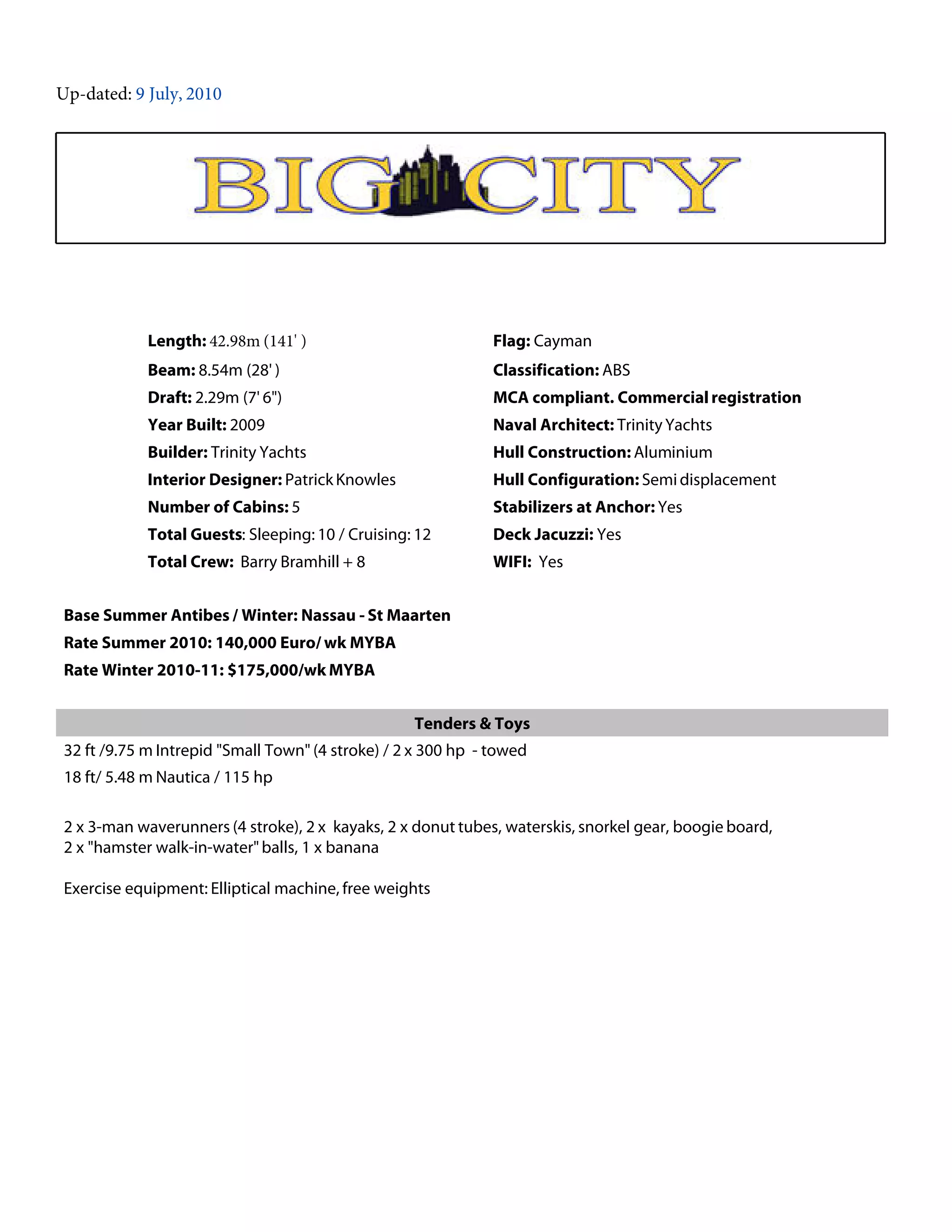 This document provides details on a 42.98m luxury motor yacht built in 2009 by Trinity Yachts. It has 5 guest cabins that can sleep up to 10 guests and accommodations for up to 8 crew members. Entertainment amenities include a movie server, exercise equipment, and water toys. The yacht is available for charter in the summer in Antibes at EUR 140,000 per week and in the winter in Nassau/St. Maarten at $175,000 per week.