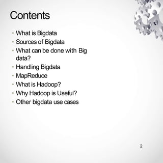 The document discusses the concept of big data, its challenges, and the technologies used to manage it, including Hadoop and MapReduce. It explains the types of data and the importance of distributed computing for handling large datasets efficiently. Various use cases of big data are highlighted, showcasing its impact in industries like automotive and e-commerce.