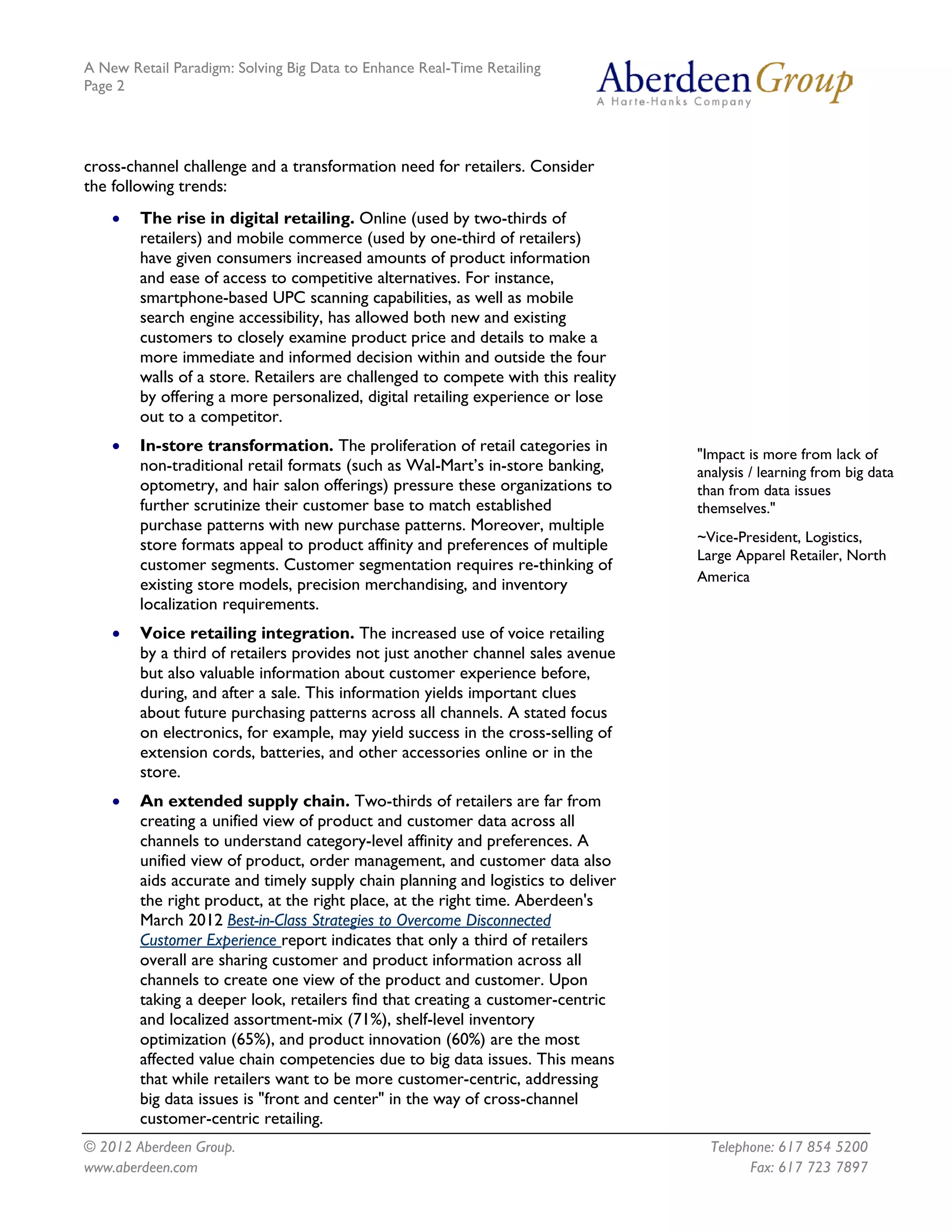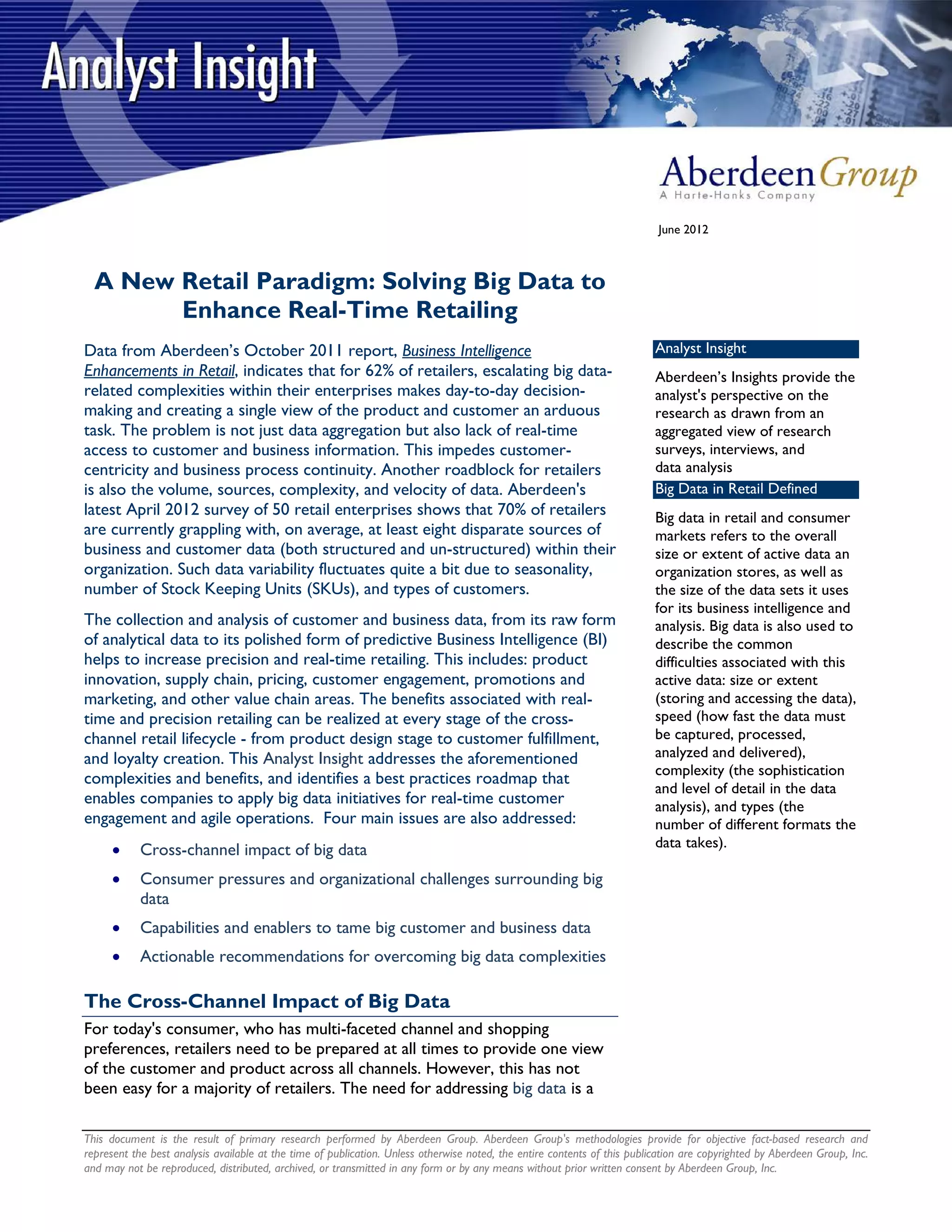 The document discusses how big data is creating challenges for retailers in providing a unified view of customers and products across channels in real-time. It finds that 70% of retailers grapple with at least 8 disparate data sources, making analysis difficult. While real-time insights could improve operations, only a third of retailers currently share cross-channel customer and product data. The document provides recommendations to help retailers better utilize big data.