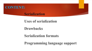 Serialization is the process of converting data structures into a format that can be stored or transmitted. It allows data to be sent between processes, stored in databases or files, and used for remote procedure calls. While serialization enables these useful functions, it can also break encapsulation and expose private implementation details if not done carefully. There are many different serialization formats used, including XML, JSON, YAML, and language-specific formats. Many programming languages have built-in support for serialization through standard libraries and modules.