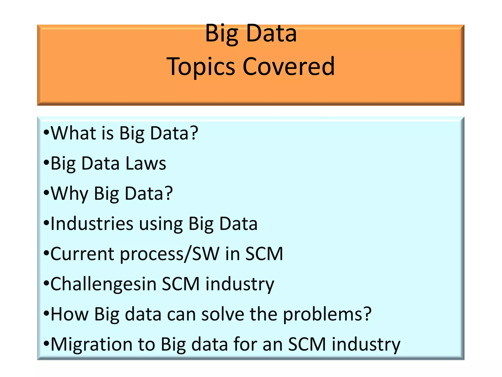 The document extensively covers the concept of big data, its applications across various industries, and the technologies available to harness it, including analytics and data warehousing. It also discusses the challenges in supply chain management (SCM), the benefits of big data in this sector, and specific case studies on how companies can leverage big data to improve operations and decision-making. Additionally, the document outlines the migration process to big data systems for SCM industries.