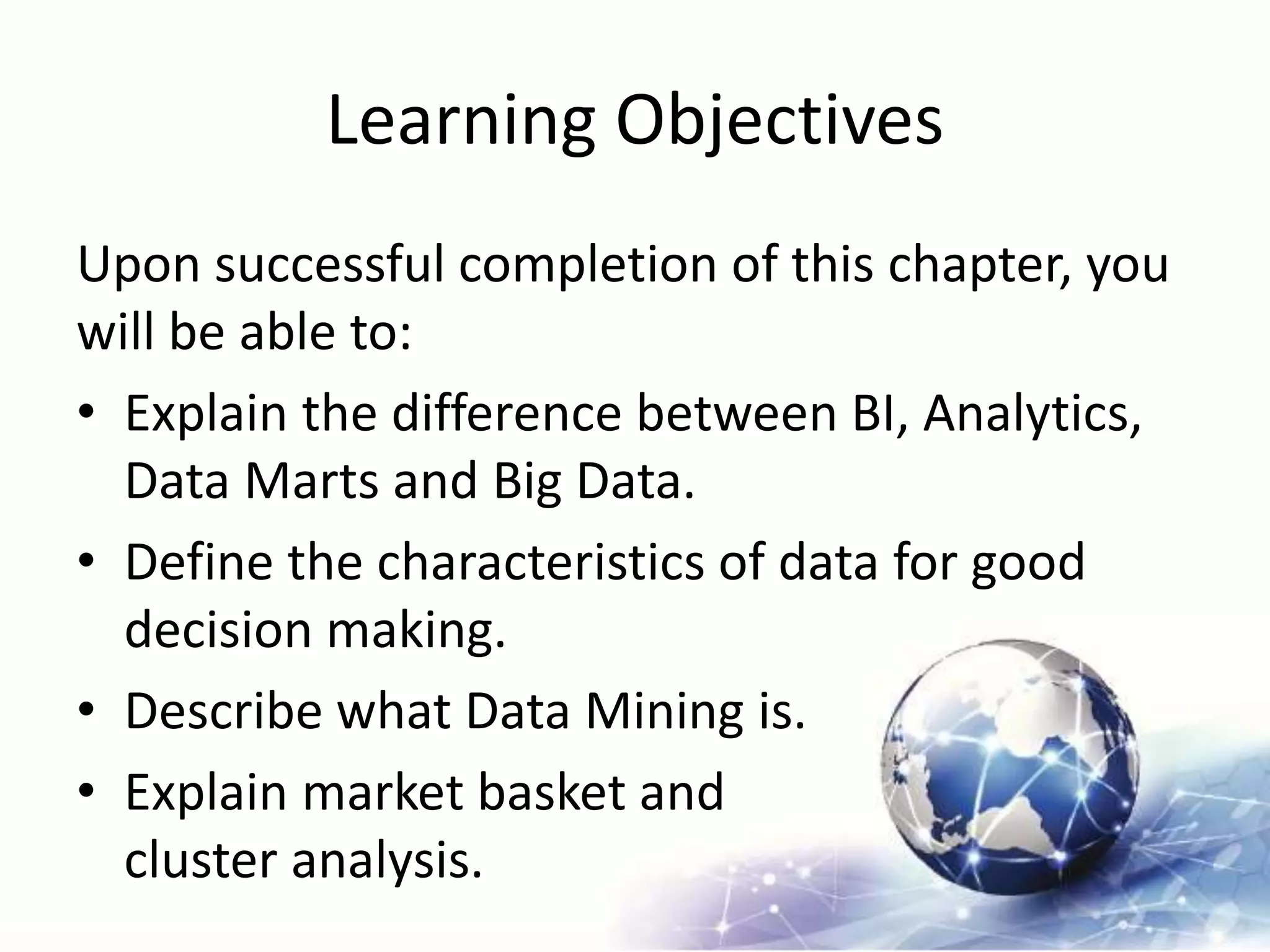 This document discusses business intelligence, analytics, data mining, and their relationships. It defines business intelligence as tools and techniques to analyze data and provide meaningful information for decision making. Data mining examines large datasets to discover patterns and hidden features. The document provides examples of market basket analysis, which finds purchasing patterns, and cluster analysis, which groups similar data together.
