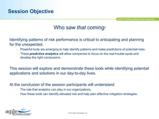 The document discusses big data and data mining tools. It provides an agenda for a session that will explore big data tools and demonstrate their use in identifying patterns and predicting risks. The session aims to show how these analytics can help organizations identify areas of elevated risk and help plan mitigation strategies. A live demo is presented analyzing patterns in Facebook likes to predict attributes about users. The document concludes that big data tools are now widely available and can provide organizations a competitive advantage through predictive analytics.