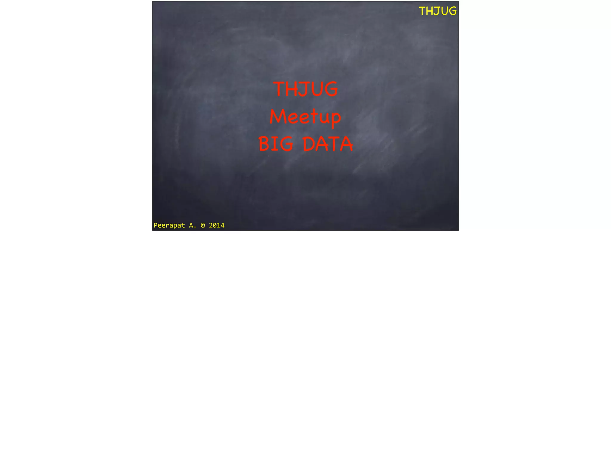 2014 THJUG Data Structure Level Example Structure RDBMS Semi-structure XML, JSON Quasi-structure Text Document Unstructure Image, Video ก่อนจะเริ่ม Big Data ขอทบทวน Data Structure นิดหน่อย ก็ตามรูปครับ อยากให้มองรูปแบบของตาต้าในโลกเป็นสี่ส่วนตามรูป