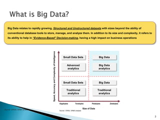 Big data relates to large and complex datasets that are difficult to analyze using traditional methods. It refers to datasets that are too large to be handled by typical database management tools. Big data can help organizations make better evidence-based decisions by analyzing structured and unstructured data from a variety of sources using specialized analytical techniques.
