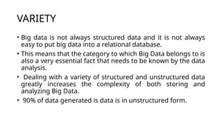 Big data encompasses both structured and unstructured data, with 90% of it being unstructured, complicating storage and analysis. Key sources of big data include media, the cloud, and the web, each offering unique advantages such as real-time insights, flexibility, and accessibility. Media, especially social media, is crucial for understanding consumer behavior, while cloud and web sources provide a scalable and diverse environment for data-driven insights.