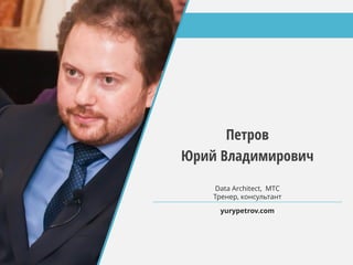 Презентация Юрия Петрова посвящена инфраструктуре big data, включая ее ценность, применение в различных отраслях и преимущества перед традиционными системами обработки данных. Основное внимание уделяется архитектуре big data, технологии hadoop, контейнерам данных и методам анализа больших массивов информации. Авторы рассматривают также способы интеграции и обработки данных в реальном времени, использование скоростных витрин и возможности графовых баз данных.