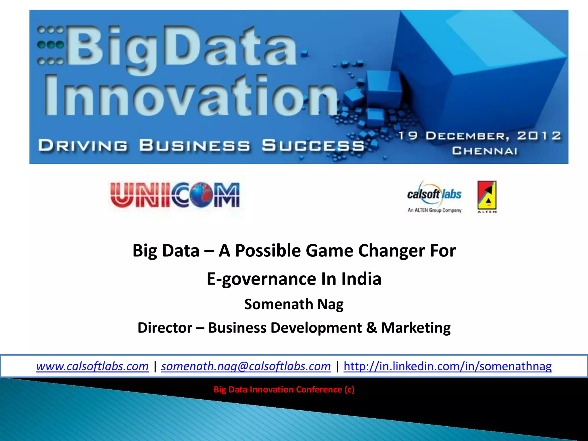 The document discusses the transformative potential of big data for e-governance in India, highlighting its ability to enhance efficiency, transparency, and resource utilization. It outlines challenges in current e-governance initiatives and presents big data as a solution, particularly in education by predicting student dropouts. The document emphasizes the importance of both structured and unstructured data in improving governance outcomes and overall citizen engagement.