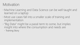 The document discusses the current state and challenges of data science in enterprises, noting that while many organizations plan to implement advanced analytics programs, a significant number of big data projects are unsuccessful. It highlights various tools and platforms, particularly focusing on Azure's offerings such as Azure Databricks and Azure ML, for seamless machine learning and big data analytics. Additionally, the document emphasizes the importance of collaboration and diverse skills in optimizing data science practices within organizations.