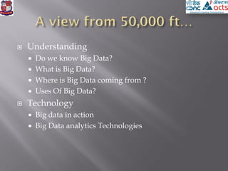 This document provides an overview of big data concepts including definitions of big data, sources of big data, and uses of big data analytics. It discusses technologies used for big data including Hadoop, MapReduce, Hive, Mahout, MATLAB, and Revolution R. It also addresses challenges around big data such as lack of standardization and extracting meaningful insights from large datasets.