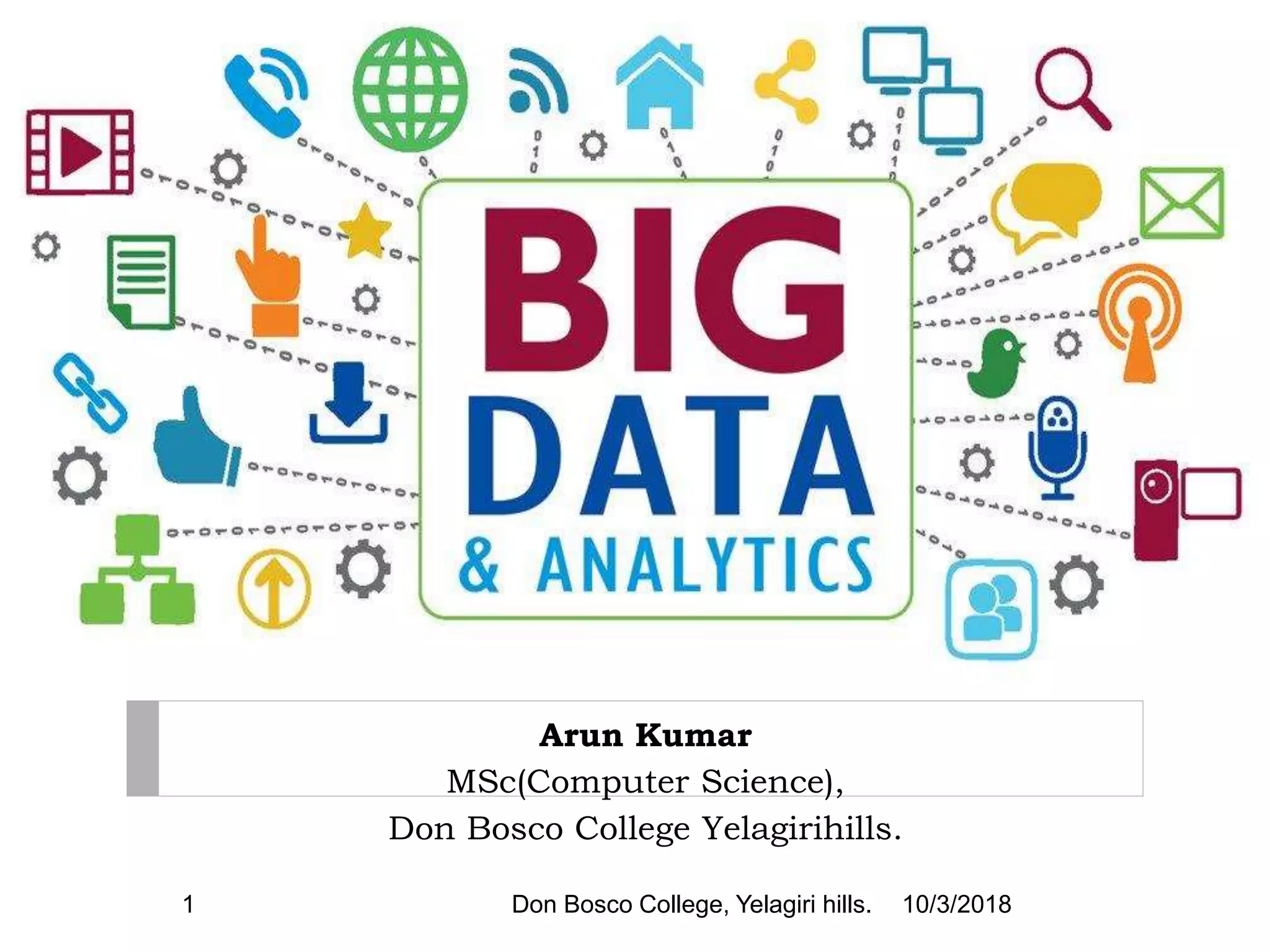 1) It defines big data and discusses its key characteristics of volume, velocity, and variety.