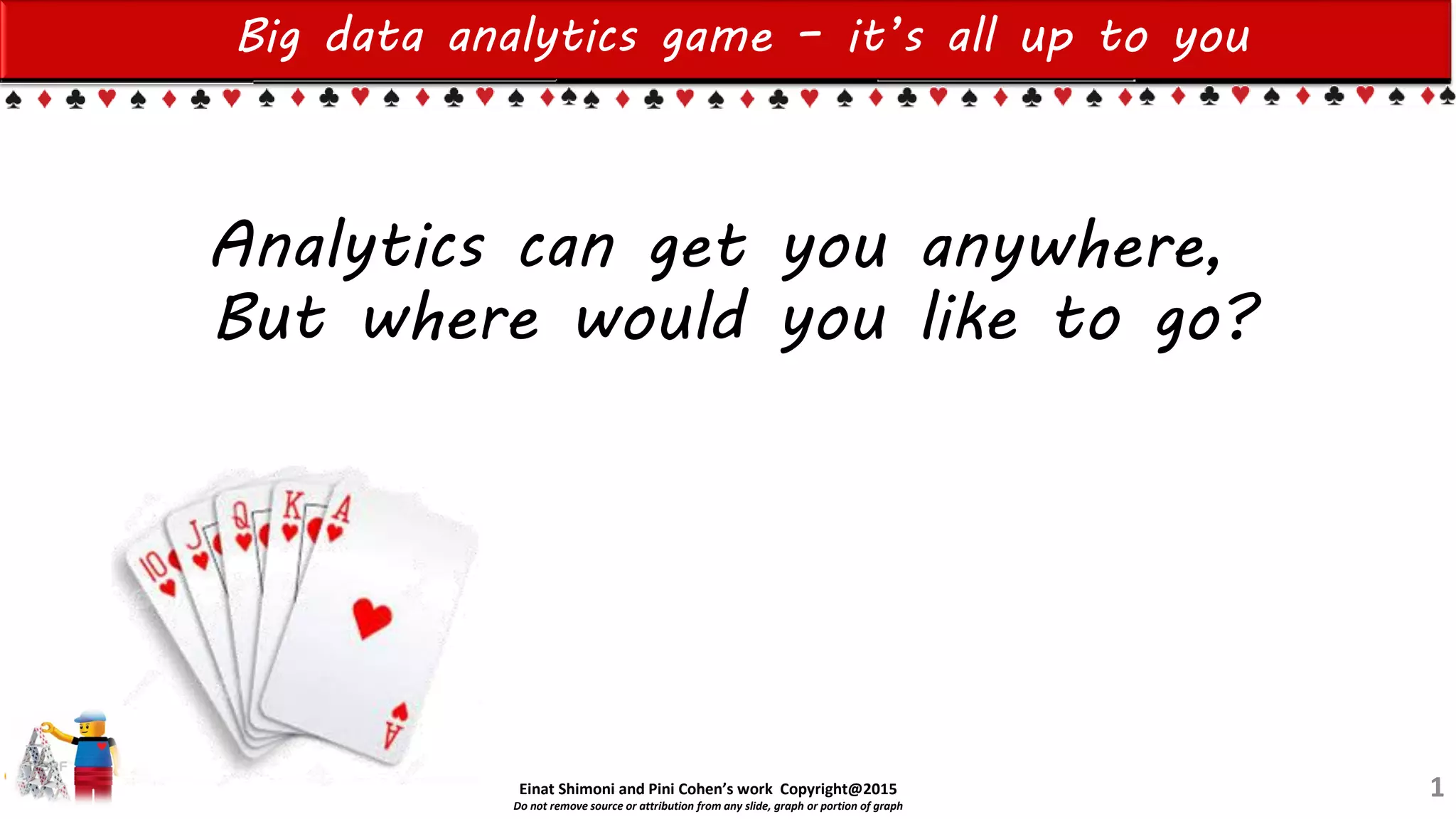 The document discusses big data analytics and tools. It introduces the concept of an "Internet of Corporate Things" and expanding analytics beyond just corporate data. It emphasizes that new tools and approaches are needed to take advantage of big data. The document provides guidance on starting a big data analytics initiative, including choosing a pilot use case, designing a new data architecture with a data lake, building an analytics center of excellence, and training analysts. It also summarizes various big data analytics tools for storage, delivery, and analyzing large datasets.