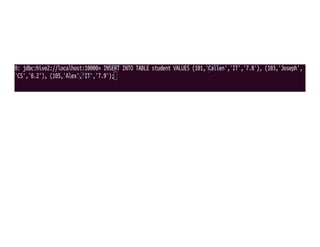 This document provides an overview of Apache Hive, including its architecture and features. It states that Hive is an open source data warehouse system built on Hadoop that allows users to query large datasets using SQL-like queries. It is used for analyzing structured data and is best suited for batch jobs. The document then discusses Hive's architecture, including its drivers, metastore, and Thrift interface. It also provides examples of built-in functions in Hive for mathematical operations, string manipulation, and more. Finally, it covers Hive commands for DDL, DML, and querying data.