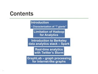 2. It introduces several distributed data analytics platforms like Spark, Storm, and GraphLab that can perform tasks like linear algebra, graph processing, and iterative machine learning algorithms more efficiently than Hadoop.