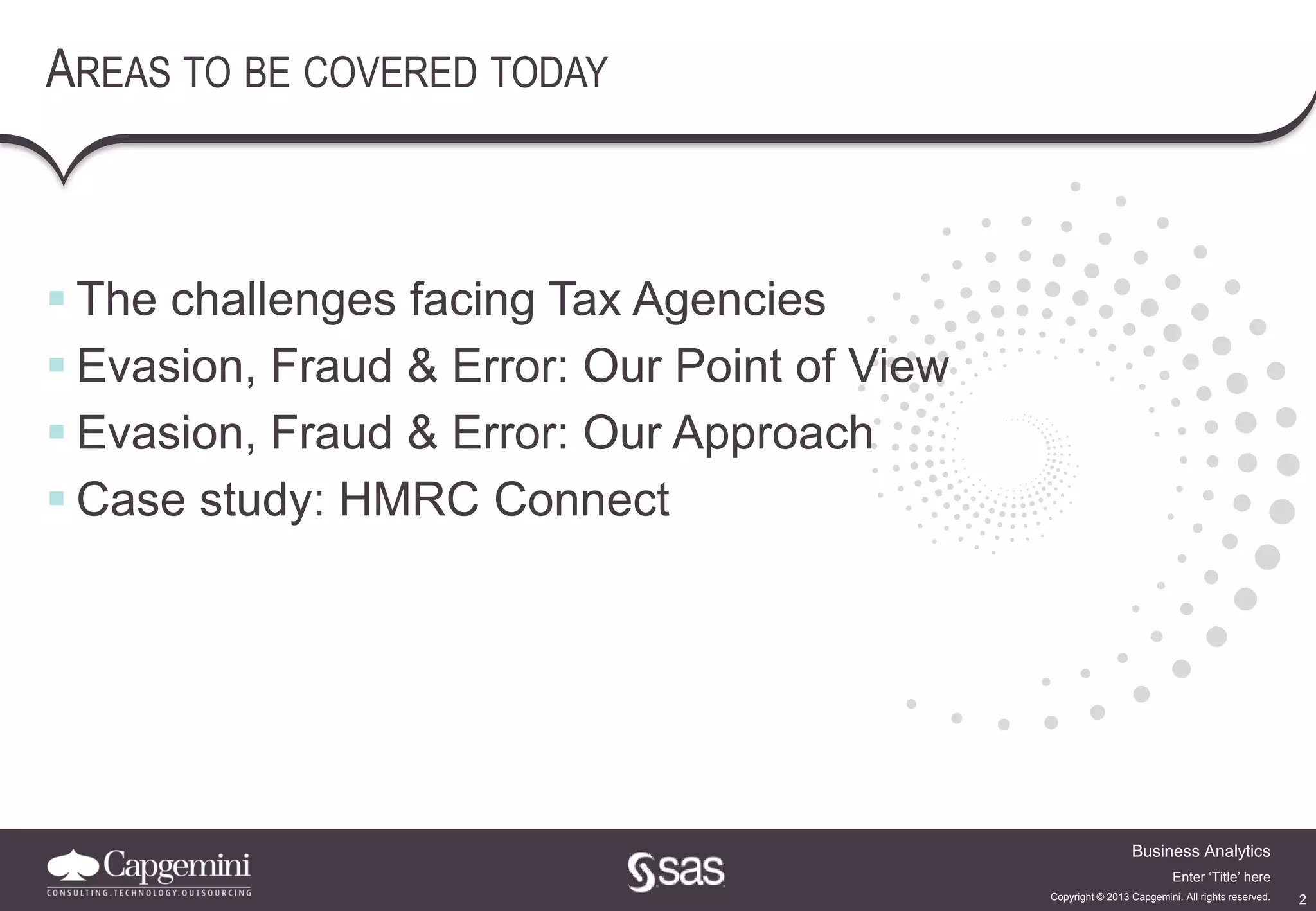 The document discusses the integration of big data and analytics in tax management, focusing on the challenges of evasion, fraud, and error. It highlights approaches to improve compliance through real-time data analysis and customer insights, with case studies from HMRC and Maharashtra showcasing successful implementations. Capgemini's expertise and global partnerships in fraud management further emphasize their commitment to enhancing tax revenue processes.