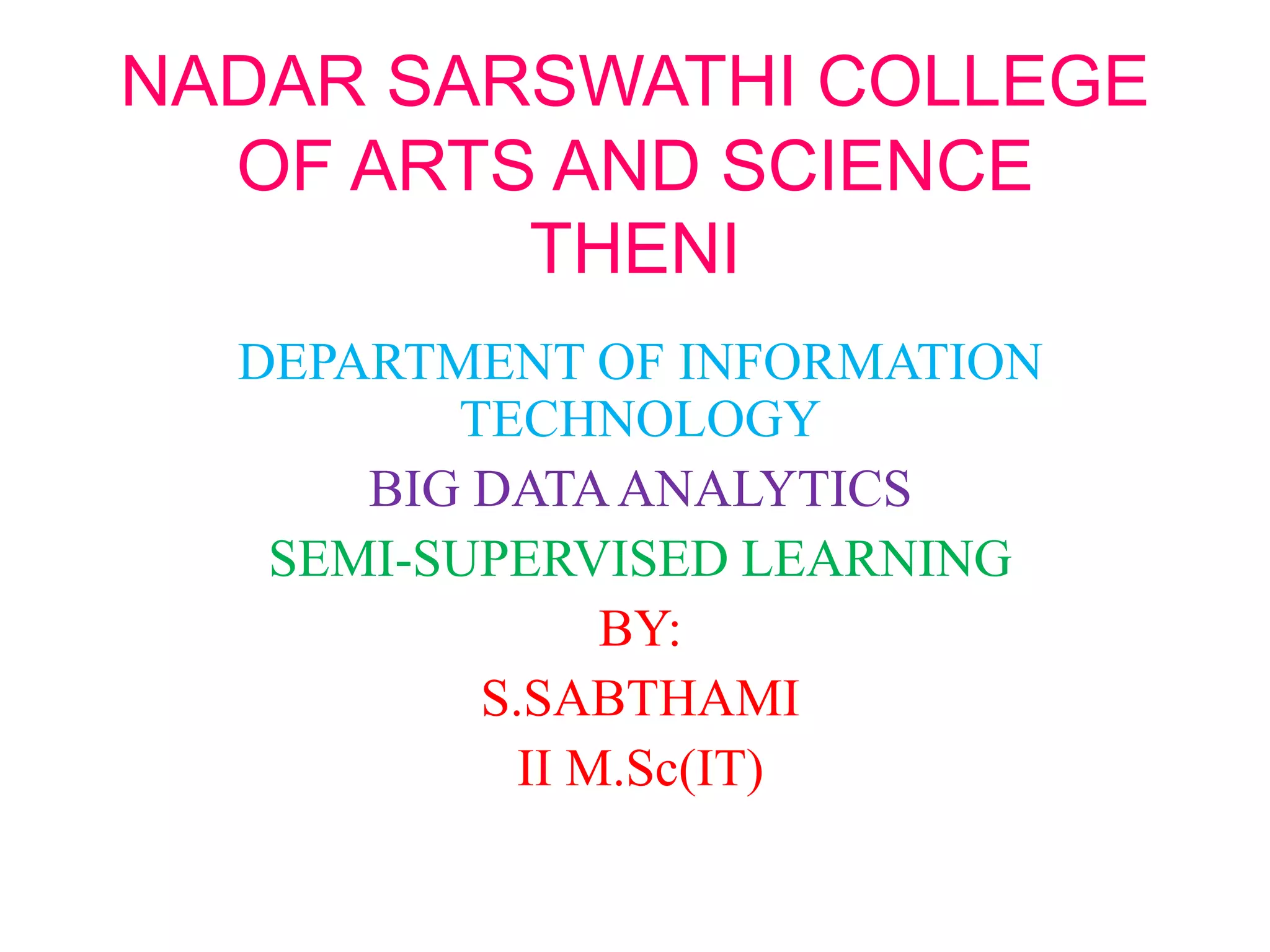The document discusses semi-supervised learning applications in big data analytics, illustrating the challenges in labeling and classifying unlabeled data. It covers techniques such as expectation maximization for clustering, improvements through Laplace estimates, and the co-training method for classifiers. The document also addresses the complexity issues and limitations faced in current approaches to semi-supervised learning.