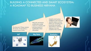 1. The document discusses concepts related to big data and analytics, including how the internet of things generates large amounts of data from connected devices.