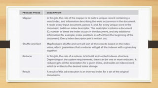 This document discusses cloud and big data technologies. It provides an overview of Hadoop and its ecosystem, which includes components like HDFS, MapReduce, HBase, Zookeeper, Pig and Hive. It also describes how data is stored in HDFS and HBase, and how MapReduce can be used for parallel processing across large datasets. Finally, it gives examples of using MapReduce to implement algorithms for word counting, building inverted indexes and performing joins.