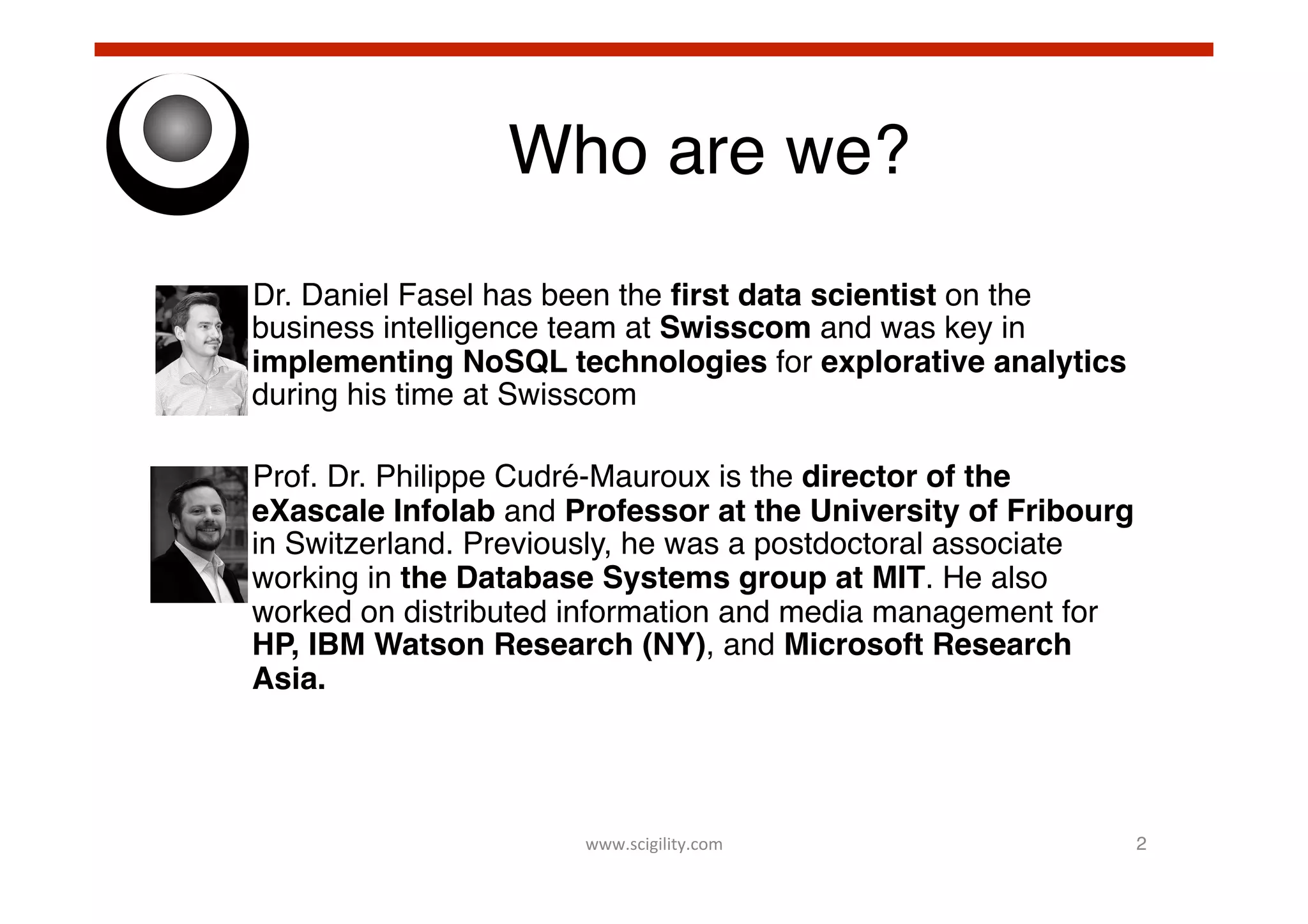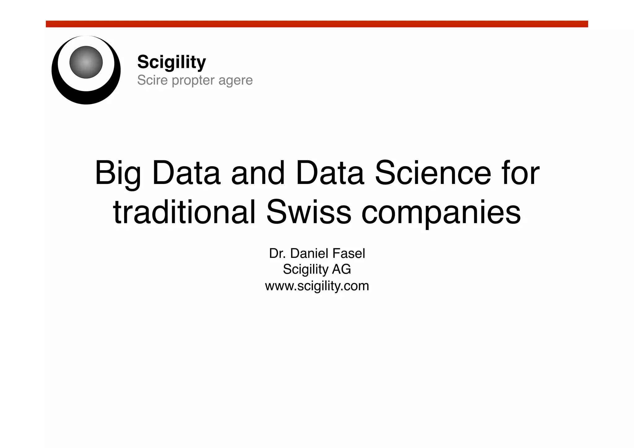 Scigility AG offers consulting, software development, and training in big data technologies for traditional Swiss companies, led by experts Dr. Daniel Fasel and Prof. Dr. Philippe Cudré-Mauroux. The company highlights the significance of big data, emphasizing its volume, variety, and velocity, and presents new techniques and technologies for data analysis and operations. Demonstrations include multi-structured data indexing, real-time streaming, and collaborative filtering, showcasing practical applications of big data solutions.
