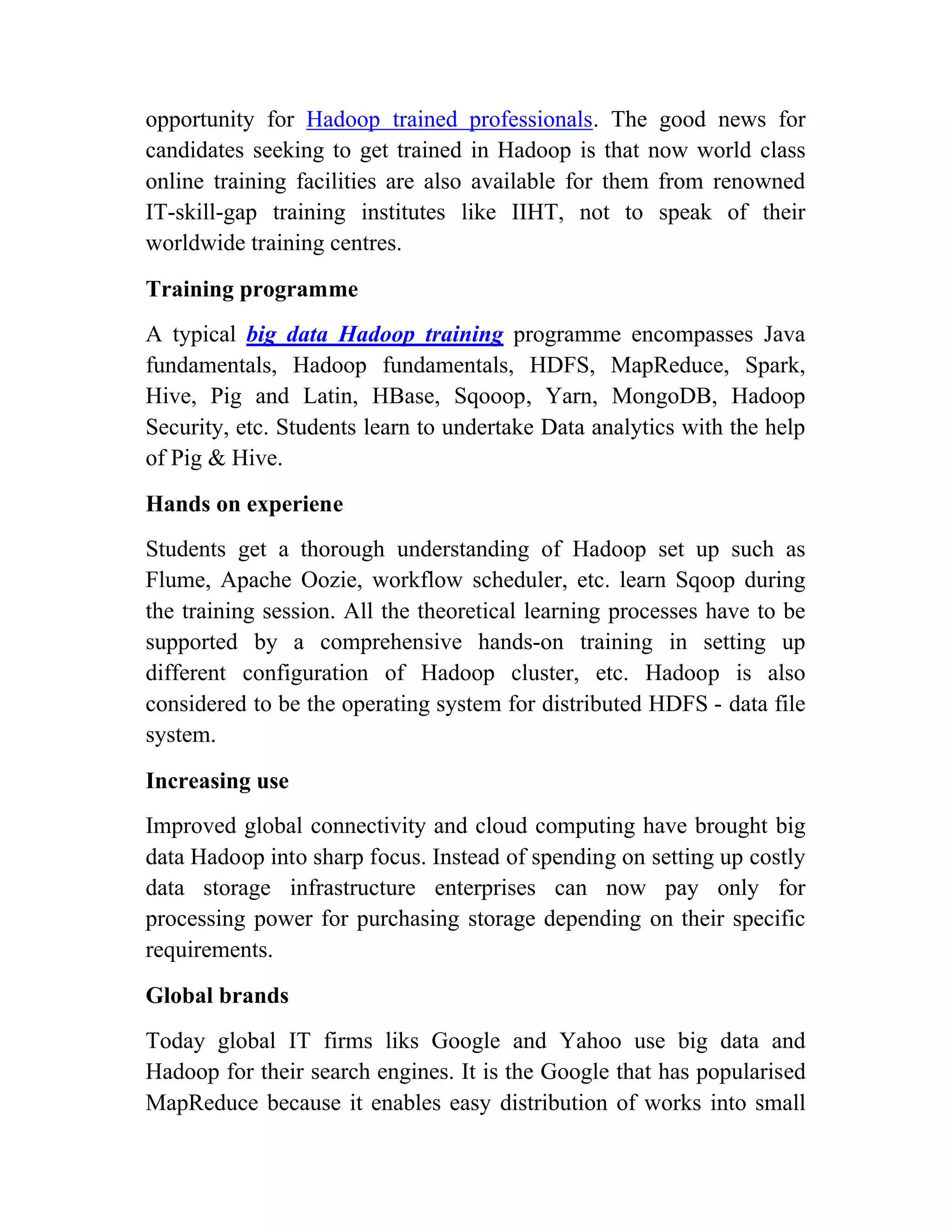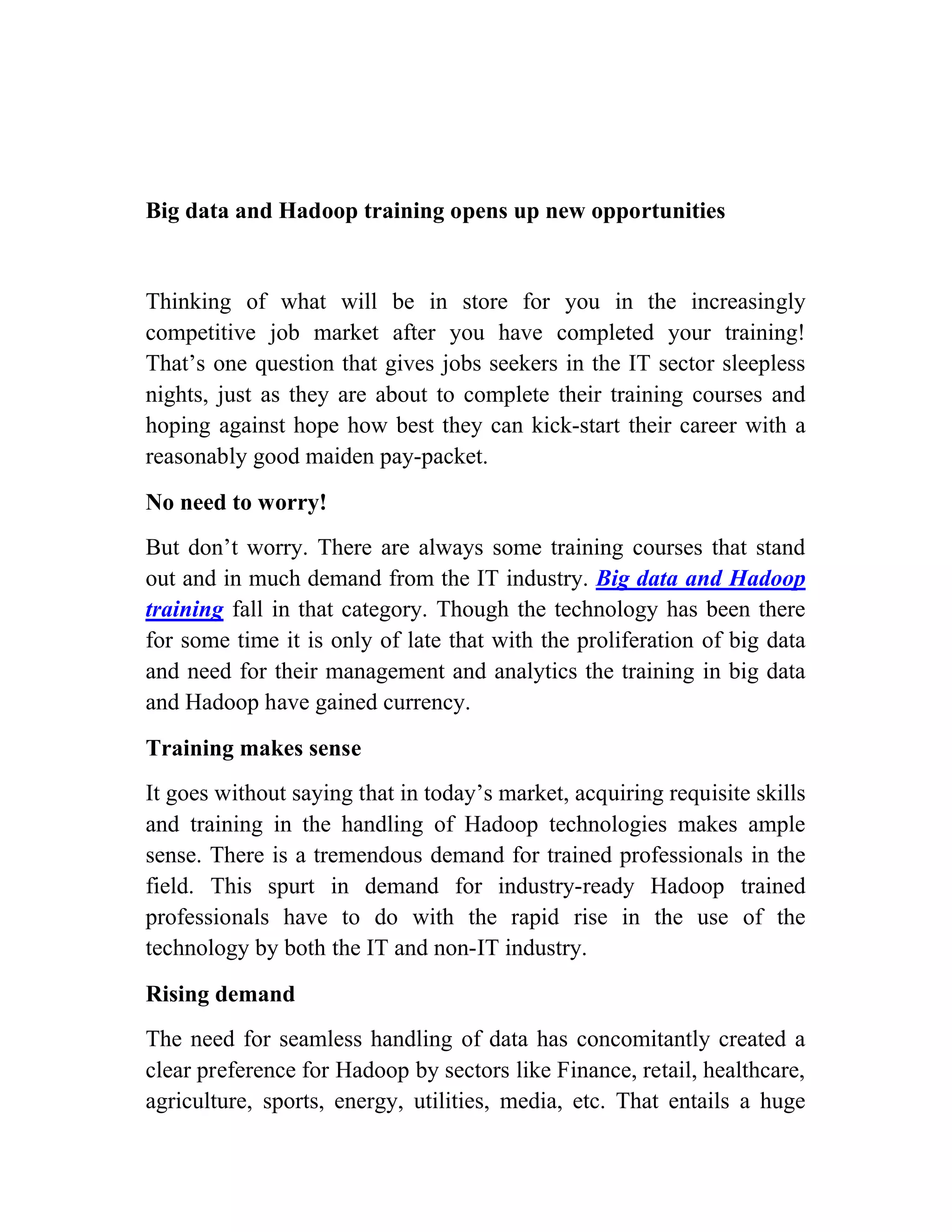 Big data and Hadoop training is in high demand from employers seeking professionals with these skills. There is a large market for professionals trained in managing and analyzing big data using Hadoop due to the proliferation of data and need for its management. Training in Hadoop provides students with skills needed to work with technologies like HDFS, MapReduce, Spark, Hive and Pig to undertake data analytics. Completing such a training program opens opportunities for jobs in many industries that increasingly rely on Hadoop to handle their data needs.