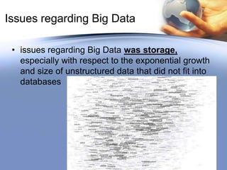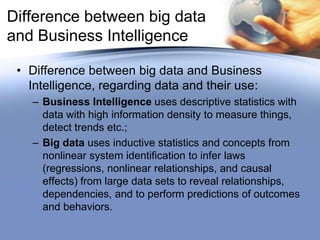 The document discusses big data, highlighting its complexity and the challenges enterprises face in managing it, encapsulated in Gartner's '3Vs' model: volume, velocity, and variety. It emphasizes the importance of effective data strategies and analytics in enhancing decision-making and driving business growth, alongside the necessary executive support for successful implementation. The document also outlines the role of data-driven insights in transforming operations and creating competitive advantages across various sectors.