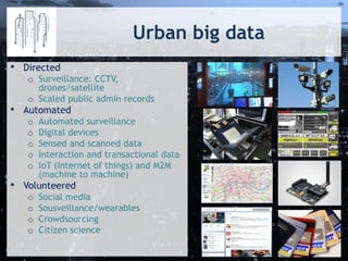 This document discusses key issues around big data and smart cities. It outlines different types of urban big data like directed data from surveillance cameras and automated data from digital devices. It also discusses how single systems can become integrated across a whole city and different sectors. The document then critiques smart cities and discusses concerns around data ownership, privacy, hacking, and how data could reinforce inequalities. It also outlines technical data concerns regarding access, integration, quality, analysis, and skills.