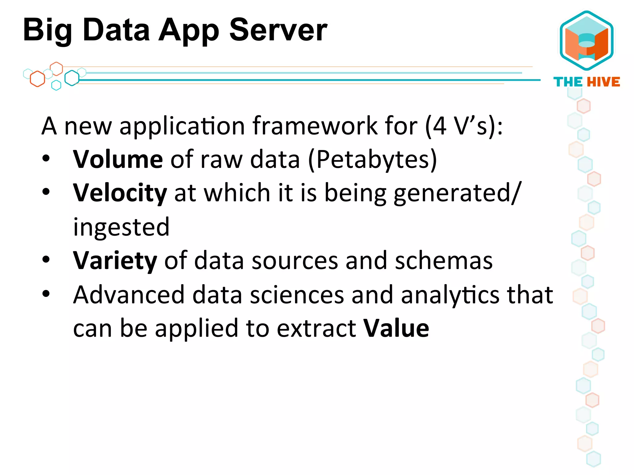 This document describes a big data application server framework for handling large volumes, velocities, and varieties of data to extract value. It discusses use cases like log analytics, security detection, sensor data analytics, and recommendation systems. The document then summarizes several key components of big data platforms, including storage and compute systems like HDFS and MapReduce, data ingestion with Apache Flume, workflow systems like Oozie, schema management with HCatalog and Avro, data access with HBase and SQL querying with Hive and Impala.