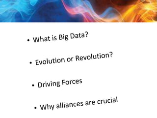 This document discusses big data and strategic alliances. It begins with an introduction to big data and notes that big data has become a major topic at both government and business levels. It then outlines the three V's (volume, velocity, variety) that characterize big data. Several drivers of big data's exponential growth are mentioned, including social media, smart sensors, wireless networks, cloud computing, and mobile apps. The document argues that while big data volumes are large, the real revolution comes from disruptive forces across technologies. It notes that strategic alliances will be needed to integrate capabilities across groups like wireless, cloud, databases, and social/sensors. The document advocates focusing alliances on addressing capability gaps and outlines different alliance models.