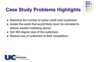 The document outlines key challenges and trends in the banking industry's credit card sector, emphasizing the importance of big data analytics for customer engagement and retention. It proposes solutions such as personalized offerings, intelligent chatbots, and fraud detection to enhance customer satisfaction and streamline marketing strategies. The document concludes that leveraging big data can improve decision-making, reduce costs, and increase revenue in banking operations.