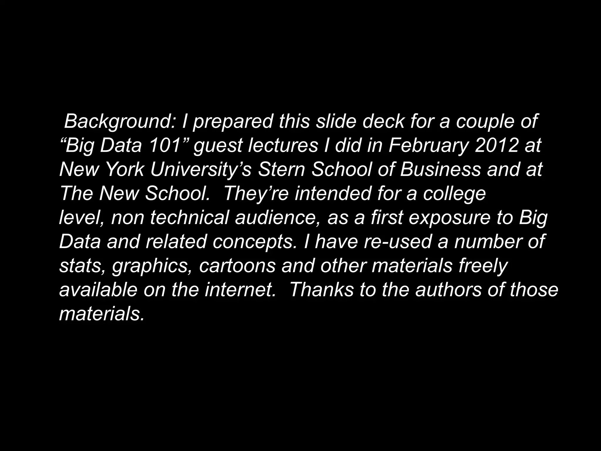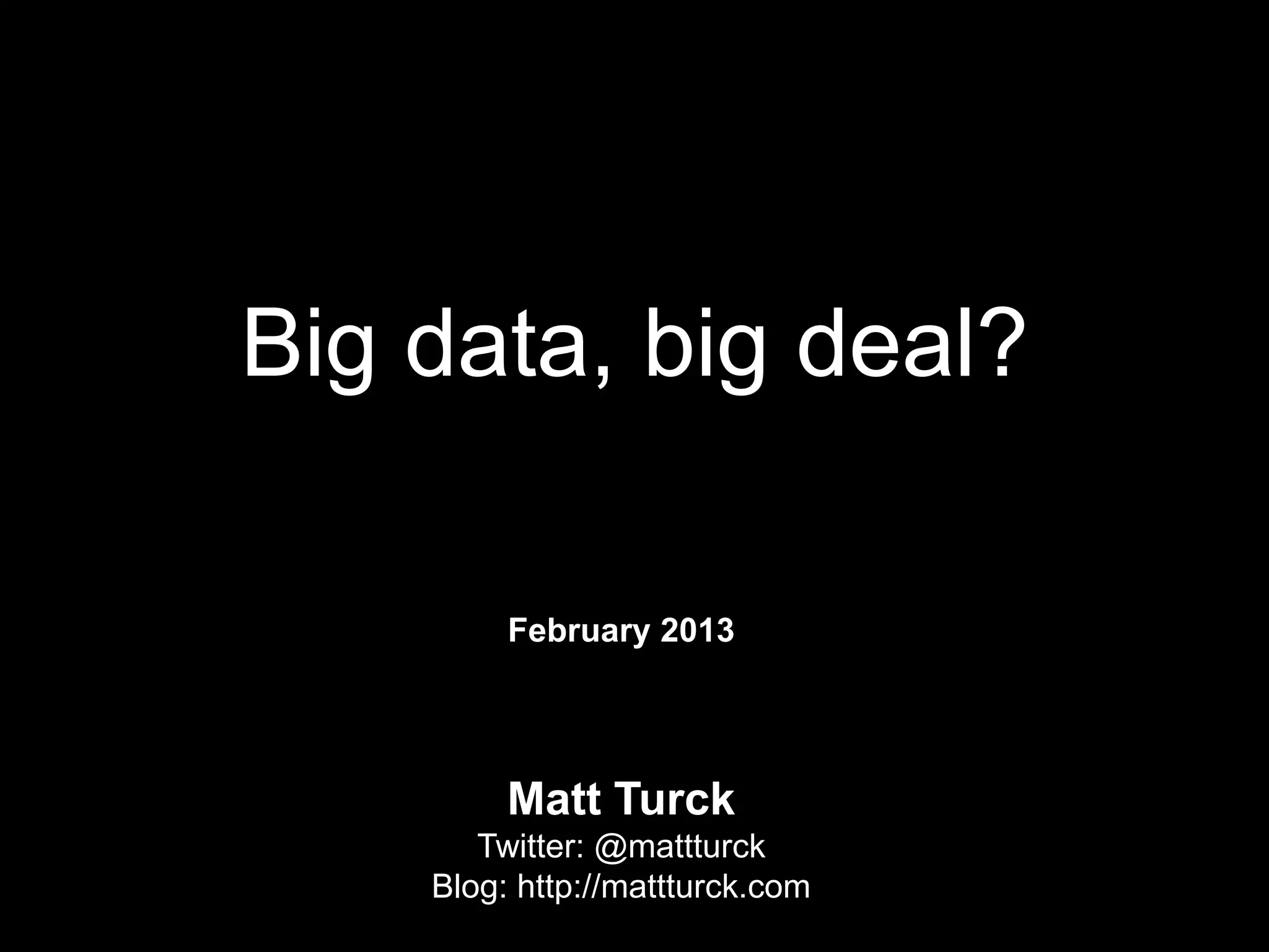The document is a slide deck prepared by Matt Turck for non-technical audiences to introduce the concept of big data, outlining its characteristics such as volume, variety, and velocity. It discusses the need for new technologies to process this data, highlights the emerging role of data scientists, and emphasizes the significance of data-driven decision-making in various industries. The presentation also touches on the distinction between big data and small data, advocating for a balanced approach to data utilization.